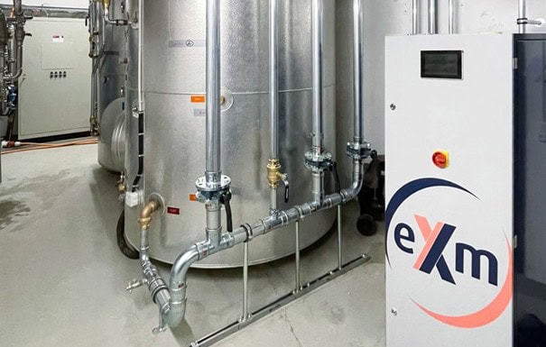 - Die eXm ist eine mit Strom betriebene Wasser‑Wasser‑Wärmepumpe, ausgelegt für Quellentemperaturen bis ca. 55 °C und für große Temperaturhübe. Die eXm wird an einen Pufferspeicher (Heizspeicher) angeschlossen.