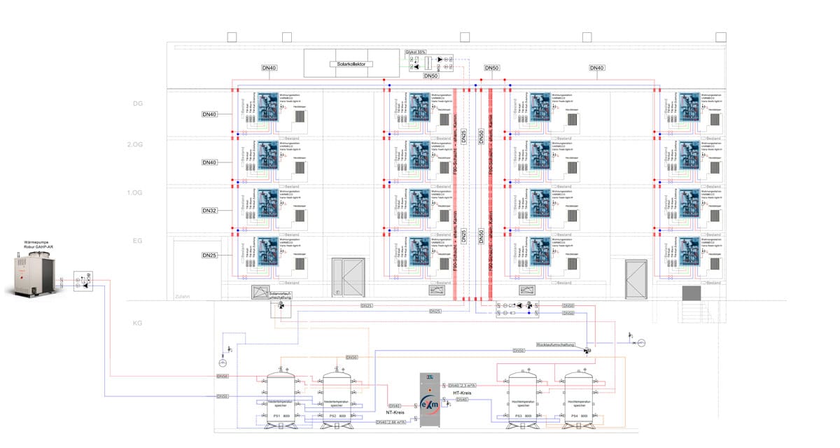 | Anlagenpark, energierelevante Sanierungsmaßnahmen | Gasetagenheizung mit konventionellen Radiatoren | Zentralheizung mit Erdgas-Wärmepumpe 35 kW, Solarthermie 50 m², eXergiemaschine 40 kW und 2 x 800 l Heizspeicher; Wohnungsstationen; Fußbodenheizung; Dämmung Gebäudehülle; Modernisierung Dach |